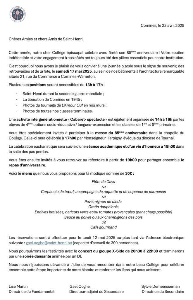 Le Collège épiscopal Saint-Henri vous invite à une journée de commémoration et de partage le samedi 17 mai 2025.